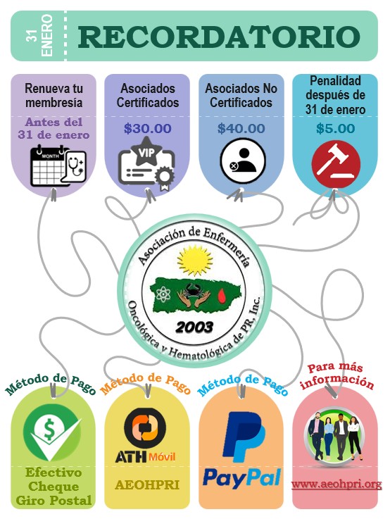 La Asociación de Enfermería Oncológica y Hematológica de Puerto Rico, Inc. te recuerda que la fecha límite para renovar tu membresía para el periodo 2026 es el 31 de enero. Evita penalidades y asegura tu participación activa en nuestra comunidad profesional.