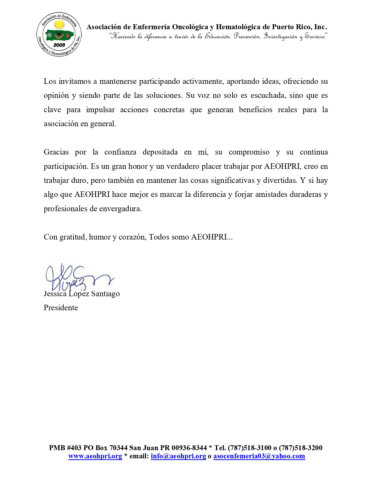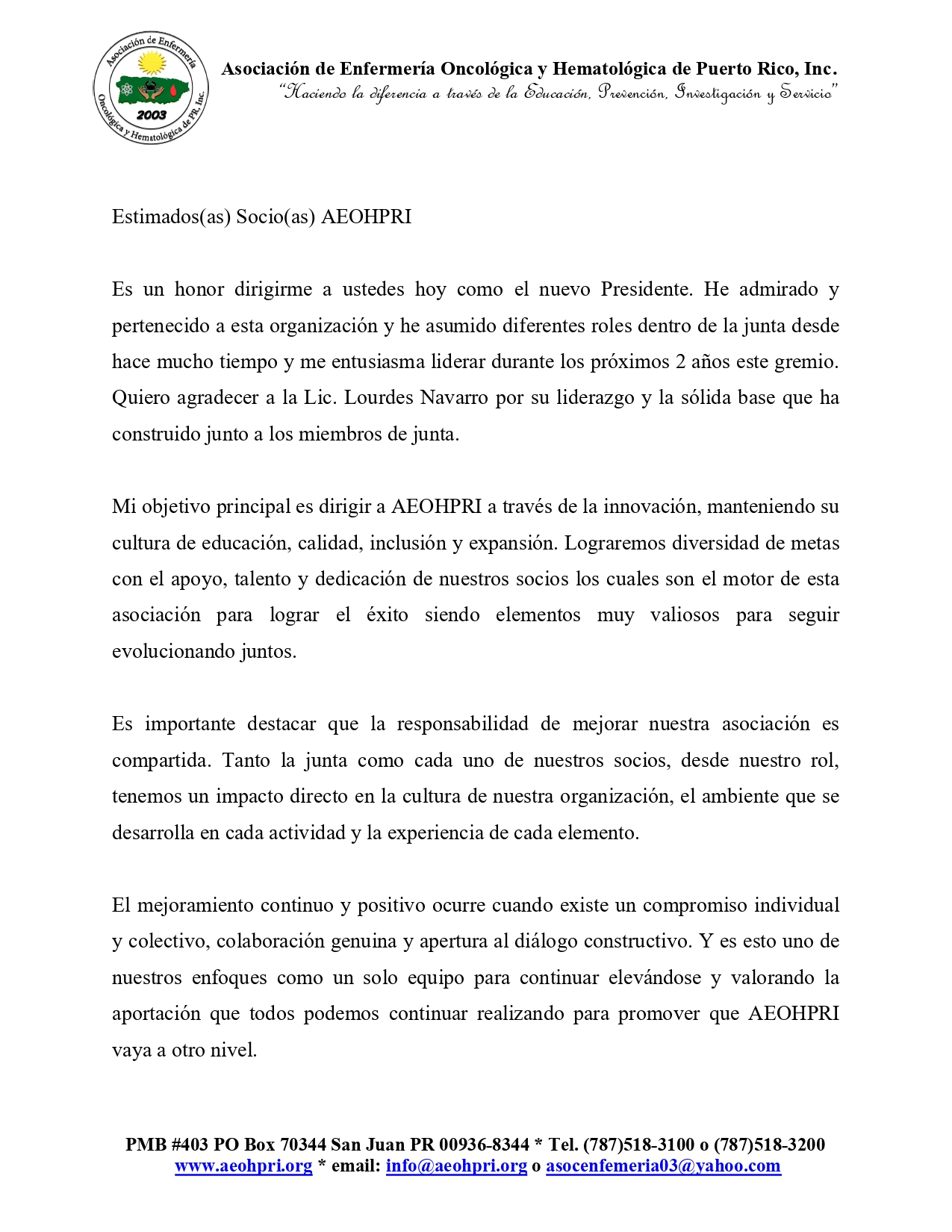 La Asociación de Enfermería Oncológica y Hematológica de Puerto Rico, Inc. te recuerda que la fecha límite para renovar tu membresía para el periodo 2026 es el 31 de enero. Evita penalidades y asegura tu participación activa en nuestra comunidad profesional.