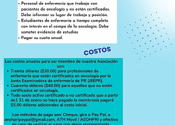 La Asociación de Enfermería Oncológica y Hematológica de Puerto Rico, Inc. te recuerda que la fecha límite para renovar tu membresía para el periodo 2026 es el 31 de enero. Evita penalidades y asegura tu participación activa en nuestra comunidad profesional.