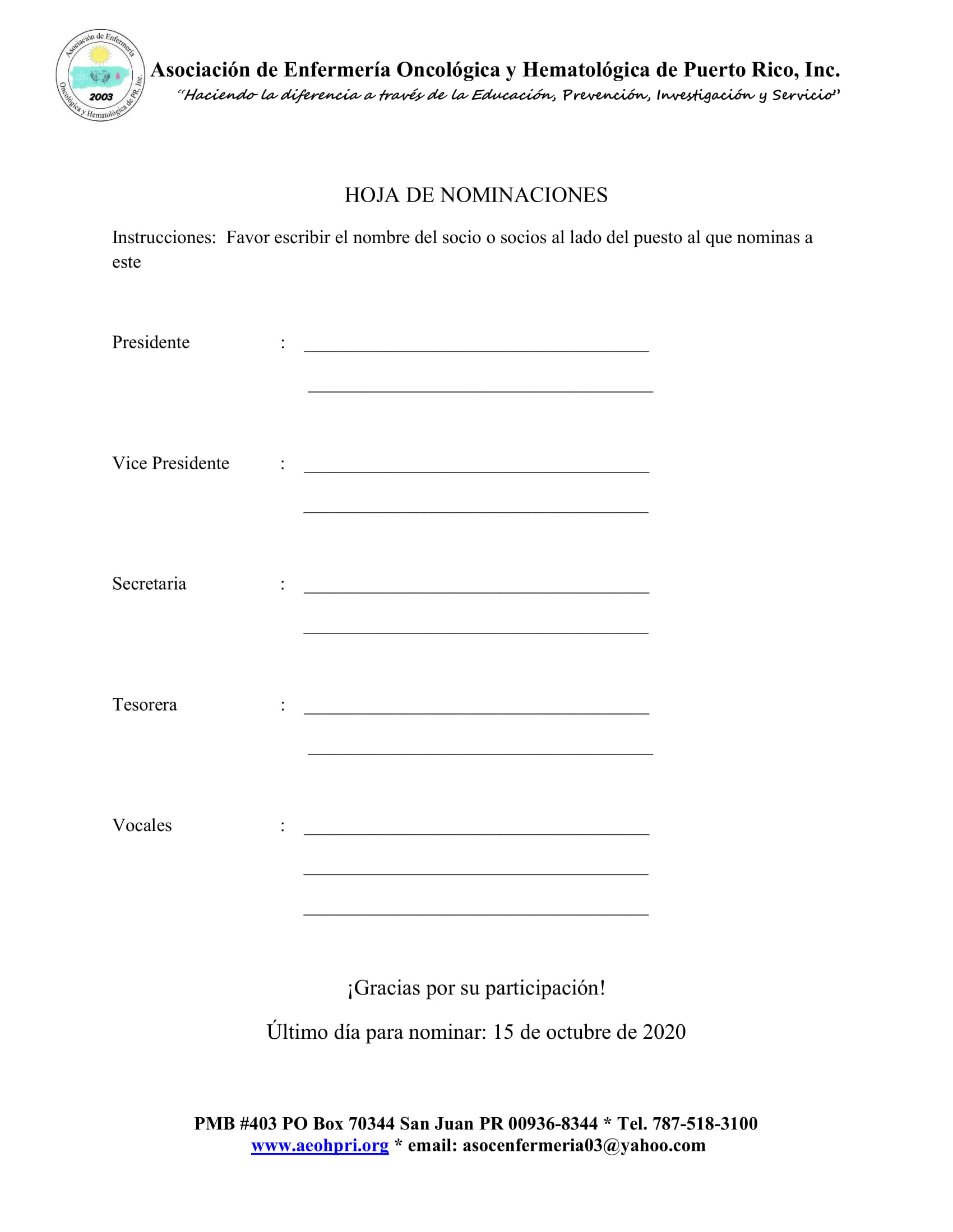 Favor escribir tus nominados o candidatos y enviar la forma debidamente cumplimentada a
